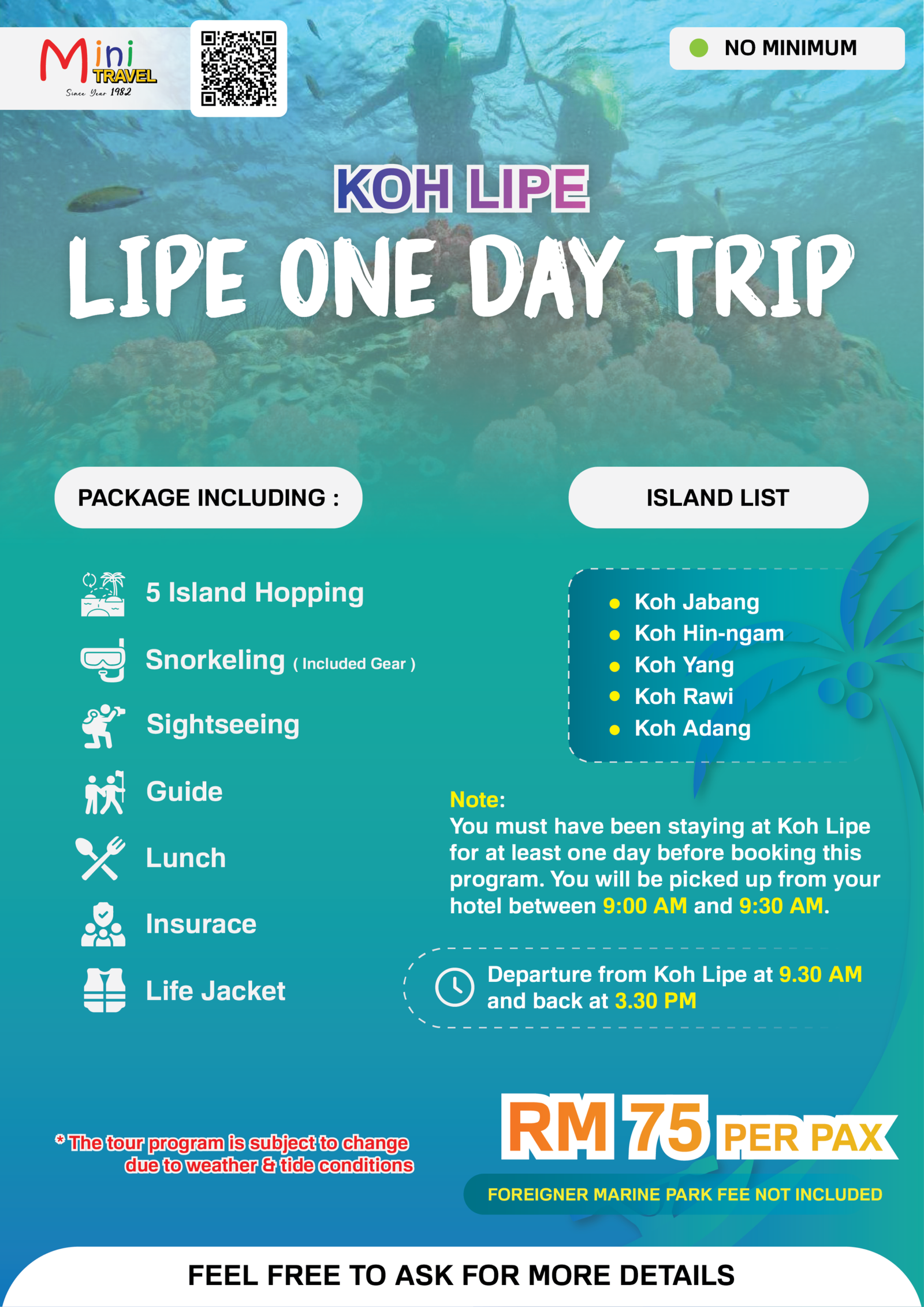 Departure from Koh Lipe at 9.30 AM and back at 3.30 PM